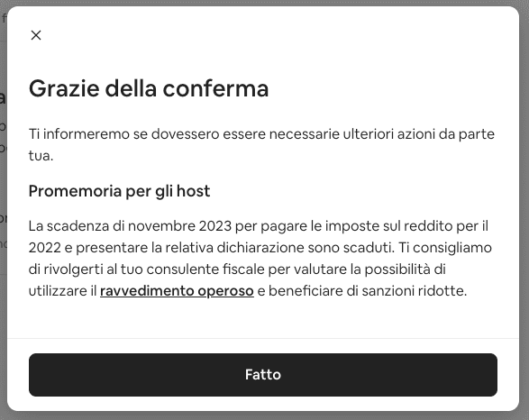Altra breve nota riguardo al recente contenzioso in cui il portale è rimasto invischiato: al momento, Airbnb ha invitato gli host a dichiarare i compensi del 2022 non ancora tassati, attraverso il ravvedimento operoso, entro il 28 febbraio. Per il 2023, invece, si dovranno dichiarare i compensi nella prossima dichiarazione dei redditi.